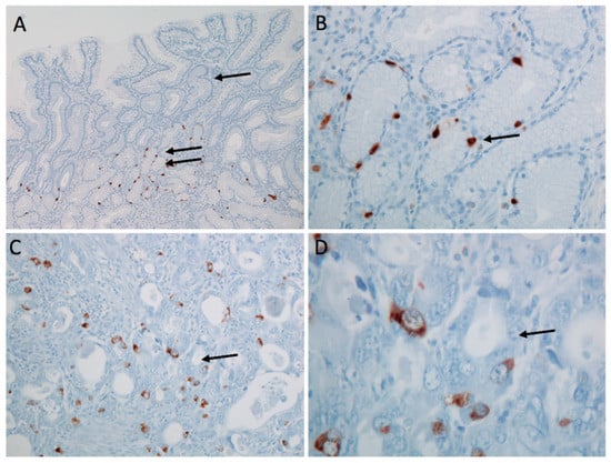 - Choi, E.; Roland, J.T.; Barlow, B.J.; O’Neal, R.; Rich, A.E.; Nam, K.T.; Shi, C.; Goldenring, J.R. Cell lineage distribution atlas of the human stomach reveals heterogeneous gland populations in the gastric antrum. Gut 2014, 63, 1711–1720. [Google Scholar] [CrossRef]