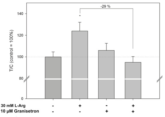 Influence of 10 µM of the 5-HT3 receptor antagonist granisetron on L-Arg-induced serotonin release by HGT-1 cells. Data are shown as average ± standard deviation of treated over control (T/C) samples, with data from L-Arg-treated cells set to 100% (T/C = 100%). n = 3–4, tr = 2; statistics: one-way ANOVA vs. control followed by Holm–Sidak post hoc test (*: p < 0.05).