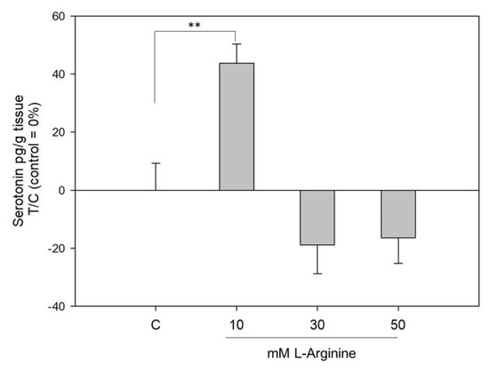 Impact of L-Arg on serotonin release in human gastric tissue. Data are presented as mean ± SEM, treated over control (=Krebs-Ringer-HEPES buffer) set to 0%. n = 2–3 tr = 2–4; one-way ANOVA vs. control followed by a Holm–Sidak post hoc test (**: p < 0.01).