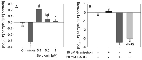 (A) Impact of incubation with 0.1–1 µM serotonin on proton secretion in HGT-1 cells. 1 mM HIS represents the positive control histamine in a concentration of 1 mM. n = 3–6, tr = 6; statistics: one-way ANOVA on ranks followed by Dunn’s post hoc test vs. control. (B) Impact of 10 µM 5-HT3 receptor antagonist granisetron on L-Arg-induced proton secretion, n = 3, tr = 3–6; statistics: one-way ANOVA followed by Holm–Sidak post hoc test. Different letters indicating statistical differences (p < 0.05).