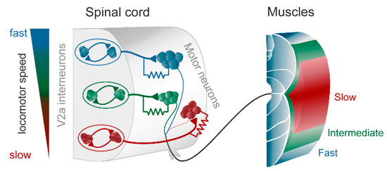 - Song, J.; Dahlberg, E.; El Manira, A. V2a interneuron diversity tailors spinal circuit organization to control the vigor of locomotor movements. Nat. Commun. 2018, 9, 3370. [Google Scholar] [CrossRef] [PubMed]