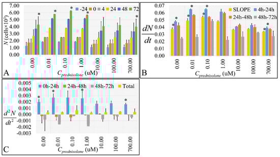 The effect of prednisolone on cell population as detected by the Coulter method. We estimated the absolute cell population (A), along with its change rate (dN/dt) (B) and cell size change acceleration (d2N/dt2) (C). Cell population change rate was estimated as the first derivative of cell population in each time point. Cell population change acceleration was calculated as the second derivative of the cell population in each time point (* depict a significance at the p < 0.01 level. “Total” implies the change rate and change rate acceleration respectively from time point 0 h to 72 h).