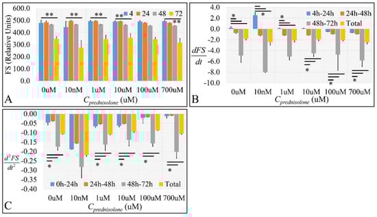 The effect of prednisolone on cell size as detected by flow cytometry. We estimated the absolute cell size (A), along with cell size change rate (B) and cell size change acceleration (C). Cell size change rate was estimated as the first derivative (dFS/dt) of cell size in each time point and cell size change acceleration was calculated as the second derivative (d2FS/dt2) of the cell size in each time point (** depicts a significance at the p < 0.001 level between concentrations and * depicts a significance at the p < 0.01 level. “Total” implies the change rate and change rate acceleration respectively from time point 0 h to 72 h).