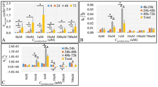 The effect of prednisolone on cell necrosis as detected by flow cytometry. We estimated the absolute necrotic cell population (A), along with the necrotic cell population change rate (B) and necrotic cell population change rate “acceleration (C). Necrotic cell population change rate was estimated as the first derivative (dN/dt) of necrotic cell population in each time point and cell size change “acceleration” was calculated as the second derivative (d2N/dt2) of the necrotic cell population in each time point (* depicts a significance at the p < 0.01 level between concentrations. “Total” implies the change rate and change rate acceleration respectively from time point 0 h to 72 h).