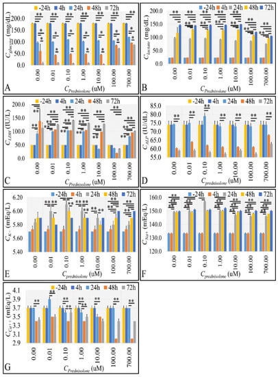 The effect of prednisolone cell metabolic factors. We measured the concentrations of glucose (A), lactate (B), lactate dehydrogenase (LDH) (C), alkaline phosphatase (ALP) (D), potassium (K+) (E), sodium (Na+) (F) and calcium (Ca+2) (G), with respect to both prednisolone concentration and time (** depict a significance at the p < 0.01 level between time-points and * depicts a significance at the p < 0.01 level. “Total” implies the change rate and change rate acceleration respectively from time point 0 h to 72 h).
