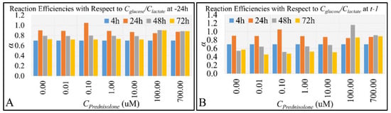 Reaction efficiencies (as depicted in Equation (1)) of glucose and its metabolite lactate. Reaction efficiencies were calculated both in a time- and dose-dependent manner. Efficiencies were calculated with respect to the mean of metabolites concentration at time –24 h and all prednisolone concentrations (A), as well as with respect to the metabolites concentrations at time t − 1, i.e., between Cglucose and Clactate at time t and Cglucose and Clactate at time t − 1 or each separate concentration (B).