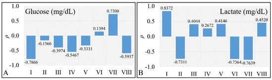 Pearson’s correlation of glucose (CGlucose) concentration with respect to other physical parameters (A) and lactate (CLactate) concentration to other physical parameters (B). Each bar (depicted here as Latin numbers) represents the calculation of Pearson’s correlation of a pair of factors as described in detail in Table 1.