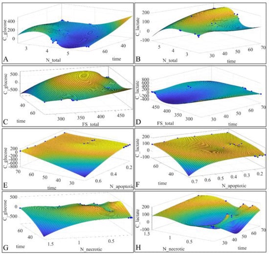 It became evident that correlations of the evaluated parameters, including both the cytological data as well as gene expression data, were not of a linear nature and thus it is reasonable that such correlations are of non-linear nature. In order to depict the inter-relations between the estimated variables for which we had previously calculated the Pearson’s correlation factor, we plotted 3D surface plots of the parameters under investigation. In particular, we plotted the CGlucose vs. the total cell population (N) and vs. time (Figure 8A), the CLactate vs. the total population (N) and vs. time (Figure 8B), the CGlucose vs. the flow cytometric forward scatter (FS) and vs. time (Figure 8C), the CLactate vs. the flow cytometric forward scatter (FS) and vs. time (Figure 8D), CGlucose vs. the apoptotic cell population (NApoptotic) and vs. time (Figure 8E), the CLactate vs. the apoptotic cell population (NApoptotic) and vs. time (Figure 8F), the CGlucose vs. the necrotic cell population and vs. time (Figure 8G) and finally the CLactate vs. the necrotic cell population and vs. time (Figure 8H). All surface plots were regressed with an interpolant, biharmonic approximation manifesting their non-linear dynamics.