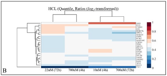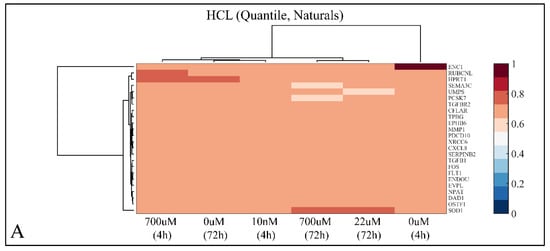 Genes were clustered both with respect to their natural values (gene expression values that were normalized, identified as DE and not log2-transformed), as well as with respect to their ratio values (log2-transformed). Based on our previous observations, if gene expression is to follow the biphasic effect of prednisolone on the leukemic cells, samples should not be clustered together with respect to their expressional profile. This was the case, as hierarchical clustering (HCL) showed that 0 μM at 72 h clustered together with 10 nM at 4 h and they both clustered together with 700 μM at 4 h (Figure 9A). In addition, 700 μM at 72 h clustered together with 22 μM at 72 h and 0 μM at 4 h was clustered independently (Figure 9A). Regarding the ratios of gene expression, 22 μM at 72 h and 700 μM at 4 h where clustered together, and 10 nM at 4 h clustered together with 700 μM at 72 h (Figure 9B).