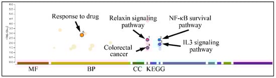 Following this, we performed functional analysis to identify relative GC functions in the genes identified by k-means clustering. DEGs manifested several interesting functions, with respect to the experimental setup, where they appeared to participate in response to drug functions, the relaxin signaling pathway, colorectal cancer, the NF-κB survival pathway and IL3 signaling pathway (Figure 10). Interestingly, oxidative stress was significantly enriched when analyzing the genes revealed in k-means analysis (Figure 11).