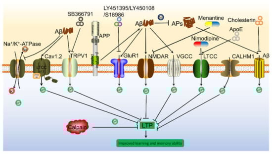 Aβ is involved in regulating Ca2+ influx via modulating Ca2+ transporters on the neuronal membranes, which result in depressing LTP and inducing cognitive decline of AD animals. Aβ can activate Ca2+ transporters, including NMDAR, AMPAR, LTCC, Na+/K+-ATPase, CALHM1, TRPV1 and Cav1.2 etc., which result in promoting Ca2+ entry into the cytoplasm, leading to elevate the concentration of Ca2+ in the neuronal cells. In addition, oligomeric Aβ can not selectively increase Ca2+ permeability of cell membrane, leading to the influx of Ca2+ from the extracellular space. More importantly, these transporters of Ca2+ have the ability to mediate the effects of Ca2+ on the synaptic plasticity via different mechanisms.