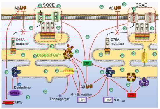 In addition to Aβ, PS1 exhibits the ability to interact with three key components of the Ca2+ signaling cascade, namely, InsP3R [,], RyR [,,] and sarcoplasmic/endoplasmic reticulum calcium ATPase (SERCA) []. Recently, Cheung et al., found that PS can physically interact with InsP3R to stimulate its gating activity, which results in an increase in Ca2+ even though there is no increase in Ca2+ in the lumens of the ER []. In SH-SY5Y cells, a PS1 mutation enhances the activity of PLC, leading to an increase in the level of IP3, which results in the release of Ca2+ from the ER []. Similarly, a PS mutation can stimulate Ca2+ release from the ER via InsP3R and RyR [,,]. In the ER membrane, there is a sarcoplasmic/endoplasmic reticulum ATPase (SERCA) pump in addition to InsP3R and RyR. In CHO cells, PS mutants bound to the SERCA pump, which disturbed the balance of Ca2+ []. In 3 × Tg mice, InsP3R and RyR mediated the release of Ca2+ from the ER, from which it entered the cytosol [,]. Interestingly, APOE4 may trigger the release of ER-Ca2+ via RyR, which promotes the formation of APs and NFTs [,,,]