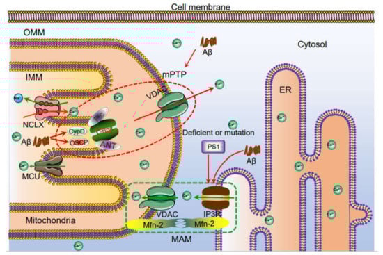 The mechanisms of Ca2+ transportation between mitochondria and ER. Ca2+ is taken up to the mitochondria via MCU. Under physiological or pathological conditions, Ca2+ is continuously shuffled between ER and mitochondria via VDAC. Moreover, Ca2+ in mitochondria induces the formation of mPTP, which traversed Ca2+ and small molecules, such as ROS and cytochrome C from mitochondria to cytosol, leading to the potential apoptosis of neurons. The loss of neurons will cause the cognitive dysfunction. Deficient or mutation: Defective PS1 due to exon 9 deletion (ΔE9), as well as PS1M146V or PS1L286V mutations, lead to Ca2+ flow to mitochondria via mitochondria associated endoplasmic reticulum membrane, (MAM), which further promotes apoptosis.