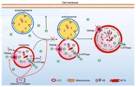 Ca2+ potentially contribute to regulate the degradation of Aβ and the deposition of hyperphosphorylated tau via its transporters, including v-ATPase and TRPML1 etc., in the membrane of lysosome. TRPML1 and v-ATPase are responsible for inducing the efflux of Ca2+ from lysosome. The accumulation of Ca2+ in the cytosol can stimulate the phosphorylation of tau in the neurons, leading to the deposition of hyperphosphorylated tau in NFTs. In addition, the loss of PS1 induces the release of Ca2+ into the cytosol via TRPML1, which results in blocking the fusion between autophagosome and lysosome, leading to prevent the degradation of Aβ.