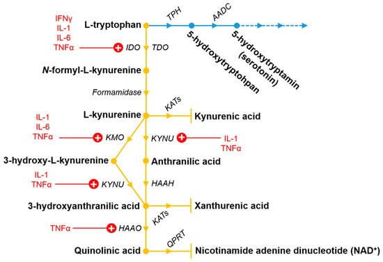 The tryptophan metabolic pathway including the kynurenine (yellow) and partly the serotonin pathway (blue). Pro-inflammatory cytokines discussed in this review which upregulate (highlighted by “+”) the different enzymes are also indicated in red. For further information, see Section 4 and Table 2. Metabolites and enzymes of the pathways are shown in bold and italic, respectively. The dashed lines in the serotonin pathway indicates the further continuation of the pathway, which is not discussed here. Abbreviations: AADC: aromatic acid decarboxylase enzymes; HAAH: 3-hydroxyanthranilic acid hydroxylase; HAAO: 3-hydroxyanthranillic acid 3,4-dioxygenase; IDO: indoleamine 2,3-dioxygenase; KATs: kynurenine aminotransferases; KMO: kynurenine 3-monooxygenase; KYNU: kynureninase; QPRT: quinolinic acid phosphoribosyltransferase; TDO: tryptophan 2,3-dioxygenase; TPH: tryptophan hydroxylase.