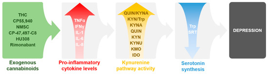 As with many psychiatric disorders, in depression, multiple neurotransmitter pathways, endocrine systems, and brain regions are involved. The endocannabinoid system (ECS) and the kynurenine pathway (KP) have long been strongly implicated in this disorder. Both systems contribute to the neuroinflammatory and serotonin hypothesis of depression, which will be discussed later on. In fact, there is a growing body of evidence showing potential common points or clear evidence for the interaction of the ECS and the KP. These were discussed previously by our group [12,13,14] among others [15,16,17,18]. This review will further support the link between the ECS and KP in the aspect of depression by summarizing the data of pro-inflammatory cytokines, which can be regulated by exogenous cannabinoids and at the same time which can regulate the KP. Additionally, pro-inflammatory cytokines, the ECS and KP in general, and regarding their role in depression will be also briefly discussed. Reviewing such data will allow a better understanding of the effect of cannabinoids on the neuroinflammatory component of depression.