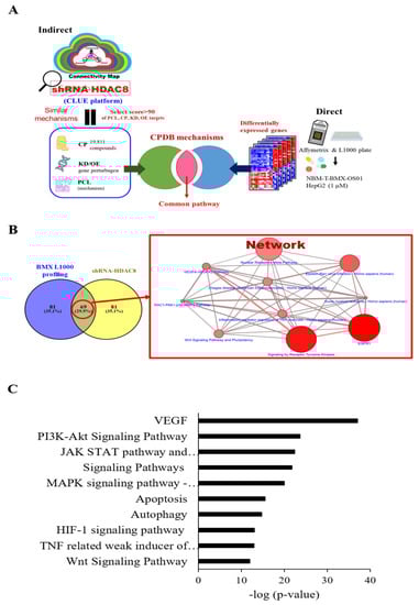 Indirect process: CLUE calculated the connectivity score of shRNA HDAC8 among their one million profiles and ordered the similarity to opposite compounds as well as gene perturbations. The criteria were filtered above 90 positive scores and collected at each instance targeted genes as shRNA HDAC8 regulators in biological function. This genes list was input into the CPDB platform for enrichment analysis to obtain clear pathways information. Direct process: Based on BMX-L1000 gene expression data, both up-regulation and down-regulation gene list respond to the drug biological function in HepG2 cells. BMX (1 μM) was compared to DMSO control to define the significant differential expression genes (DEGs) according to ±1.5 fold change, p-value < 0.05. Hence, the DEGs were used as inputs to query CPDB for pathway analysis. To narrow down the prioritized pathways, we were interested in two results and selected the common element.