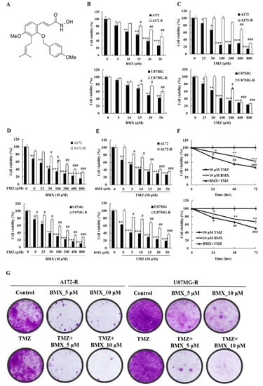 BMX inhibits the growth and proliferation of GBM cells (U87MG and A172) and the BMX and TMZ combination inhibits the growth and proliferation in GBM-R cells (U87MG-R and A172-R). (A) Chemical structure of BMX. (B) Cell viability of GBM and GBM-R cell lines after treatment with 0.5, 10, 15, 30, or 50 µM BMX. (C) Cell viability of GBM and GBM-R cell lines after treatment with 0.25, 50, 100, 200, 400, or 800 µM TMZ. (D) GBM and GBM-R cell viability after treatment with 10 µM BMX with or without TMZ at various concentrations (0.25, 50, 100, 200, 400, or 800 µM) for 24 h. (E) GBM and GBM-R cell viability after treatment with 50µM TMZ with or without BMX at various concentrations (0.5, 10, 15, 30, or 50 µM) for 24 h. (F) GBM-R cell viability after treatment with 50 µM TMZ with or without 10 µM BMX for 24, 48, and 72 h. (G) Colony formation assay of GBM and GBM-R cell lines with BMX (0, 5, or 10 µM) with or without TMZ (50 µM) for 14 days. Data are represented as means ± SEM from three experiments. * p < 0.05, ** p < 0.01, *** p < 0.05 vs. control (A172 and U87MG); # p < 0.05, ## p < 0.01, ### p < 0.05 vs. (A172-R and U87MG-R).