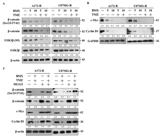 To verify that the β-catenin protein level decreased due to protein degradation, the GBM-R cells were treated with the proteasome inhibitor MG132. The results revealed that MG132 application reversed β-catenin degradation and increased c-Myc and cyclin D1 expression under 10 μM BMX and 50 μM TMZ (Figure 3C). These results demonstrated that BMX enhanced GSK3β activity through Ser9 phosphorylation downregulation, which in turn enhanced β-catenin phosphorylation at Ser33/Ser37/Thr41, triggering protein degradation. Taken together, these data revealed that 10 μM BMX and 50 μM TMZ enhanced TMZ-mediated cytotoxic effects, partly via the Wnt/β-catenin/GSK3β pathway, thus reducing GBM-R cell proliferation.