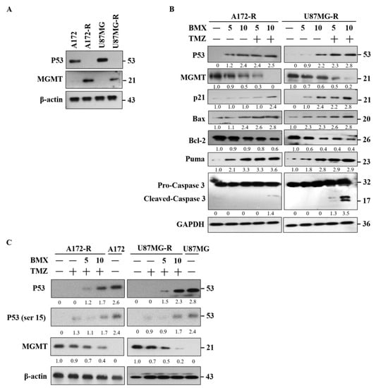 2.5. BMX Enhanced the TMZ-Mediated Cytotoxic Effects by WT-p53 Mediated MGMT Inhibition in GBM-R Cells