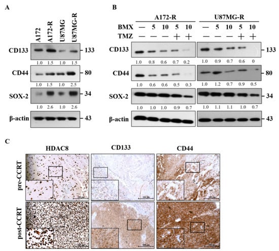 BMX and TMZ combination reduced GSC formation in GBM-R cells. (A) Status of CSC-related genes (CD133, CD44, and SOX2) expression between parental and resistant daughter cell lines. (B) Changes in CD133, CD44, and SOX2 protein levels after receiving 5 and 10 µM BMX with or without 50 µM TMZ for 48 h on U87MG-R and A172-R cells. (C) Immunohistochemical staining for HDAC8 and CSC-related genes (CD133 and CD44) in human primary GBM (the same patient before concomitant radiation and chemotherapy) and recurrent GBM tumor tissues (after concomitant radiation and chemotherapy) obtained through surgical biopsies.