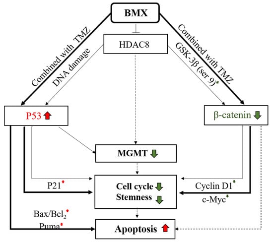 Working model of the mechanism of combination BMX with TMZ to overcome TMZ resistance in GBM-R cells. The model includes two main signaling pathways. The pathway on the right side: β-catenin/c-Myc/cyclinD1/Sox2 signaling pathway. When GBM-R cell lines were treated with BMX alone (thin lines) or BMX with TMZ (thick lines), GSK3β (S9) and active β-catenin decreased. The following c-Myc and cyclin D1 also decreased to induce cell cycle arrest and attenuate stemness activity, However, only BMX with TMZ (dashed lines) possibly induce apoptosis. The pathway on the left side: WT-p53 mediated MGMT inhibition. When GBM-R cell lines were treated with BMX alone or BMX with TMZ, WT-p53 increased and downregulated MGMT levels, cell cycle arrest, and stemness in both BMX alone (thin lines) and BMX with TMZ (thick lines). However, WT-p53 and DNA damage marker (WT-p53-ser15, not shown) increased the following the activation of cell cycle arrest marker (P21) and proapoptotic markers (BAX/Bcl2, and Puma) to induce apoptosis and cell death only in BMX with TMZ (thick lines), indicating profound DNA damage. Color red indicated up-regulation. Color green indicated down-regulation.