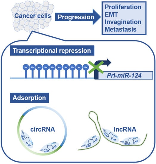 MicroRNAs (miRNAs) are short, single-stranded RNAs consisting of approximately 20 nucleotides. The first miRNA discovered was the lin-4 in Caenorhabditis elegans [1,2]. Since then, many miRNAs have been identified in many species. miRNAs play a role in regulating post-transcriptional gene expression by forming an RNA-inducible silencing complex, which binds complementarily to the 3′UTR of mRNAs and cleaves or represses translation of the mRNA. Genes whose expression is regulated by miRNAs are called target genes, and a single miRNA could potentially regulate thousands of target genes. Therefore, miRNAs contribute to a wide range of processes, from morphogenesis to disease development, carcinogenesis, and its progression. miRNAs that promote cancer development are called oncomirs, while miRNAs that suppress cancer development are called tumor suppressive miRNAs (ts-miRNAs). Although many ts-miRNAs exist [3,4], we are focusing on one microRNA, microRNA-124 (miR-124), which is important in neurogenesis. Elsewhere, epigenetic changes of miRNAs in cancer cells can also be useful as biomarkers; however, this is outside the scope of this text and is summarized in other literatures [5,6,7].