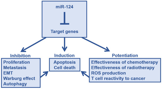 miR-124 showed anticancer effects in various stages of cancer progression, and was not only a replacement for existing treatment methods by itself, but also enhanced the effects of the existing treatment methods, probably due to the characteristic of miRNAs to regulate multiple target genes simultaneously.