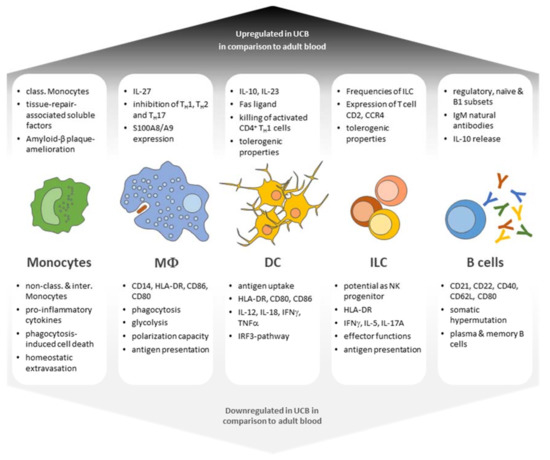Functional characteristics of UCB leukocyte populations in comparison with adult leukocyte subsets. UBC-derived leukocyte subsets display both enhanced and diminished capabilities in terms of antigen responses as well as differentiation potential and generally present a phenotype of immaturity and tolerance (class. = classical; non-class. = non-classical; interm. = intermediate).