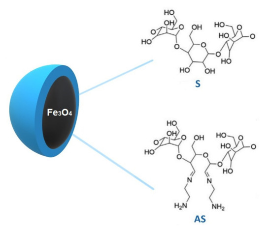 Structure of the magnetite nanoparticles coated with native starch (Fe3O4–S) and aminated starch (Fe3O4–AS).