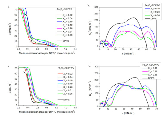 The Fe3O4–S and Fe3O4–AS nanoparticles do not create stable one-component Langmuir films due to their hydrophilic nature. Some of them sink in the water subphase during compression, which makes recorded isotherms unrepeatable. However, the binary monolayers formed from both types of nanoparticles and DPPC are compressible up to the particular concentration of the nanoparticles in a compressed mixture. Their concentration in the mixtures used for the Langmuir films’ formation increased as long as the recorded π–A isotherms were repeatable. The course of the compression isotherms for the two-component films differed from that of the DPPC isotherm for monolayers formed from mixtures containing the Fe3O4–S and Fe3O4–AS nanoparticles. The isotherms recorded for the mixed films are less steep (Figure 2a,c). The stability of the binary films was good enough to reproduce the compression isotherms, but they were less stable than the DPPC monolayer. Moreover, the compression isotherms indicated a smaller stability for the Fe3O4–S films compared to the Fe3O4–AS ones.
