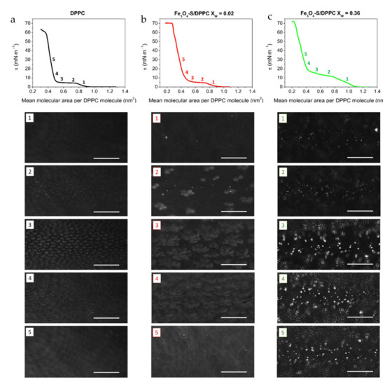 A Brewster angle microscope (BAM) is a useful tool for assessing the effect of magnetite nanoparticles on the morphology of model biomembranes formed by the Langmuir technique. The BAM images recorded during compression of the DPPC and Fe3O4–S/DPPC films with different concentrations of nanoparticles are shown in Figure 3. Numbers placed next to the π–A isotherms correspond to the compression stages, during which the BAM images (shown below the isotherms) were taken. The Fe3O4–AS nanoparticles influenced the morphology of the DPPC monolayer similarly to the Fe3O4–S nanoparticles. For this reason, the BAM images recorded for the Fe3O4–AS/DPPC monolayers are shown in Supplementary Materials Figure S1.