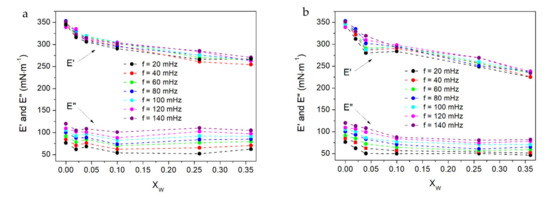 Dependencies of the elastic (E’) and viscous (E”) modulus of the Fe3O4–S/DPPC (a) and Fe3O4–AS/DPPC (b) films on their composition measured at the different frequencies of the barrier oscillations.