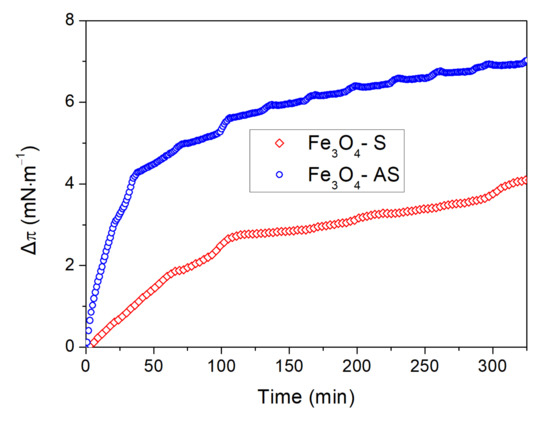 To investigate the adsorption of the Fe3O4–S and Fe3O4–AS nanoparticles into the DPPC monolayer, the kinetics of this process were recorded at a surface pressure of 30 mN·m−1. The change of the surface pressure (Δπ) as a function of time was monitored at the fixed barrier position after injection of the suspension of the nanoparticles into the water subphase. In general, the increase in the Δπ value above zero indicated the adsorption of the nanoparticles into the phospholipid monolayer. On the other hand, a decrease below zero was related to the extraction of phospholipid molecules from the air–water interface as a result of nanoparticle–phospholipid interactions. The Δπ increase was observed after injection into the water subphase of both types of nanoparticles. The Δπ took the value of ≈4.2 mN·m−1 and 7.1 mN·m−1 after 6 h from injection of the Fe3O4–S and Fe3O4–AS nanoparticles, respectively, which suggested that they were adsorbed into the DPPC monolayer. Moreover, adsorption was stronger for Fe3O4–AS nanoparticles (Figure 5).