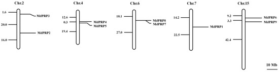 The 9 MdPRP genes were displayed using MapInspect software according to their physical sites on the Malus domestica chromosomes. The 9 MdPRP family members were distributed on 5 of the 17 M. domestica chromosomes, including two (MdPRP2 and MdPRP3) on Chr. 2, two (MdPRP4 and MdPRP5) on Chr.4, two (MdPRP7 and MdPRP8) on Chr. 6, one (MdPRP1) on Chr. 7, and two (MdPRP6 and MdPRP9) on Chr. 15 (as illustrated in Figure 1).