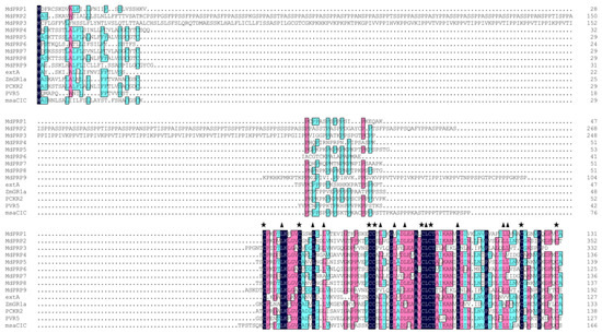 Comparison of deduced amino-acid sequence of MdPRP genes with that of other PRP proteins by DNAMAN software and numbered on the right. msaCIC (L22305), PCKR2 (X85206), extA (X67421), PVR5 (U34333), and ZmGR1a (AB018587) were from Medicago sativa, Asparagus officinalis, Arabidopsis thaliana, Phaseolus vulgaris, and Zea mays, respectively. Asterisks indicate conserved cysteine residue, and triangles indicate conserved Leucine residue in the cysteine-rich domain. Black, purple, and blue indicate that the similarity of each column of amino acids is 100%, 75%, and 50%, respectively.