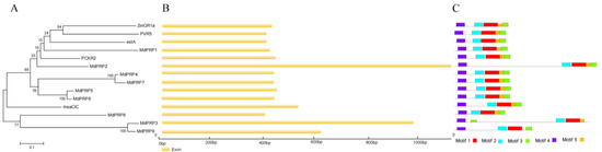 To gain a better understanding of the evolutionary relationships among the MdPRP, we constructed an NJ phylogenetic tree of all MdPRP and five other plant protein sequences, as well as their gene structures and conserved motifs. Phylogenetic trees revealed that PRP proteins were highly conserved in the six plants (as illustrated in Figure 3A). The structure of intron-exon organization may cause differences in the coding region [21]. Thus, we explored the intron-exon organization of the 14 PRP genes and found none of the genes had introns (as illustrated in Figure 3B). In an attempt to obtain the divergence and function of the MdPRP proteins, we identified five conserved motifs using online MEME. Details of these five motifs are listed in Supplemental Table S2. All predicted conserved motifs were identified only once in each MdPRP protein and were found in all MdPRP proteins except MdPRP9 (as illustrated in Figure 3C).