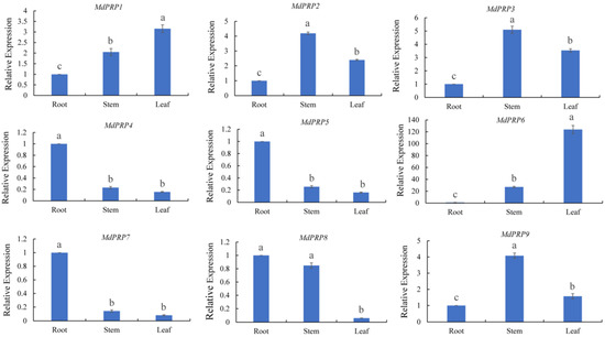 The expression of MdPRPs was tested in the roots, stems, and leaves of apple. Most MdPRP genes were expressed in all tissues, except for four genes (MdPRP4, -5, -7, and -8), which showed low expression levels in all tissues and exhibited similar expression patterns (as illustrated in Figure 4). MdPRP2, -3, and -9 were mainly expressed in the stem, and MdPRP1 was most highly expressed in the leaves. MdPRP6 was highly expressed in all tissues, especially in the leaves, and its expression was over 100-fold higher compared with that of the roots. The expression pattern of MdPRP6 differed from that of the other MdPRP genes.