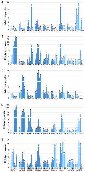 Relative expressions of MdPRPs in response to various stresses. (A) Heat treatment: treatment at 48 °C for 6 h, and the heat stress-treated leaves were collected at 0, 1, 2, 4, 5, 6 h; (B) cold stress: treatment at 4 °C for 24 h, and the cold-treated leaves were collected at 0, 2, 4, 8, 12, 24 h; for (C) drought stress, (D) salt stress, and (E) ABA stress, PEG6000 (10%; w/v), 150 mM NaCl, or 100 mM ABA were added, respectively, and the leaves were collected at 0, 2, 4, 8, 12, 24 h. MdMDH primers were used as the reference gene for each target gene. Transcript level at the 0 h in every treatment for each gene was taken as 1 when calculating relative expression levels, and those at other points were accordingly normalized and presented as relative fold changes. One-way ANOVA was used to compare statistical difference based on Tukey’s multiple range tests at significance levels of p < 0.05. Each sample was analyzed in standard deviation of three biological replicates and three technical replicates in each biological sample.