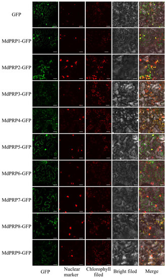 To investigate the subcellular localization of MdPRPs, the ORFs of MdPRPs were inserted into PGWB405 to produce 35S::GFP-MdPRPs and transiently coexpressed with MdHB-7-mRFP in N. benthamiana (as illustrated in Figure 6). Empty PGWB405-GFP was used as a negative control. Studies reported that MdHB-7 was located in the nucleus [22]; we used it as a nuclear maker. MdPRP1 and MdPRP5 were mainly anchored to the nucleus and cell membrane. MdPRP2, -3, -4, and -9 were mainly distributed on the cell membrane and chloroplast. The fluorescence of GFP-MdPRP6 and GFP-MdPRP7 fusion proteins was detected on cell membranes; in addition, the weak fluorescence was detected on chloroplasts in cells expressing GFP-MdPRP7 fusion protein. MdPRP8 was localized to the chloroplast. Most of the MdPRPs were observed in the cytoplasm, indicating that they are secretory proteins in apple.