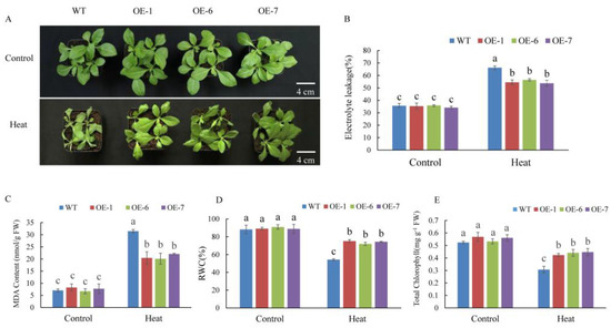 Overexpression of MdPRP6 confers enhanced heat tolerance to transgenic tobacco plants. (A) Growth phenotypes of WT and transgenic lines (Line1, Line6, and Line7) under a normal temperature and after 48 °C for 6 h. (B) Electrolyte leakage, (C) malondialdehyde (MDA) concentration, (D) relative water content (RWC), and (E) chlorophyll concentration in WT and transgenic apples treated with or without high temperature. Scale bar = 4 cm. Data are means of three replicates with SD. Different letters indicate significant differences between WT and MdPRP6 transgenic plants with or without heat stress (48 °C, 6 h), according to one-way ANOVA and Tukey’s multiple range tests (p < 0.05).