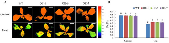 Overexpression of MdPRP6 enhanced the Fv/Fm after 6 h under control and heat conditions. (A) Fv/Fm image obtained from chlorophyll fluorescence imaging and (B) Fv/Fm. Scale bar = 3 cm. Data are means of three replicates with SD. Different letters indicate significant differences between WT and MdPRP6 transgenic plants with or without heat stress (48 °C, 6 h), according to one-way ANOVA and Tukey’s multiple range tests (p < 0.05).
