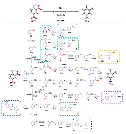 - Neri, G.; Musolino, M.G.; Rotondo, E.; Galvagno, S. Catalytic hydrogenation of 2,4-dinitrotoluene over a Pd/C catalyst: Identification of 2-(hydroxyamino)-4-nitrotoluene (2HA4NT) as reaction intermediate. J. Mol. Catal. A Chem. 1996, 111, 257–260. [Google Scholar] [CrossRef]