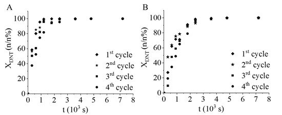 - Pinna, F.; Selva, M.; Signoretto, M.; Strukul, G.; Boccuzzi, F.; Benedetti, A.; Canton, P.; Fagherazzi, G. Pd-Fe/SiO2 Catalysts in the Hydrogenation of 2,4-Dinitrotoluene. J. Catal. 1994, 150, 356–367. [Google Scholar] [CrossRef]