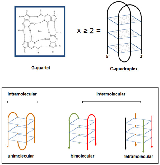 At the beginning of the twentieth century, it was suggested that guanine-rich DNA sequences have the potential to form high-order structures [1]. X-ray diffraction studies then revealed that guanylic acids may assemble into tetrameric structures that are responsible for the gel-like properties of polymeric runs of guanylic acid in aqueous solution [1]. Subsequently, it was reported that four molecules of guanylic acid may form a square planar arrangement (G-quartet) in which the guanine residues are hydrogen-bonded to each other via Hoogsteen pairings, in the presence of monovalent cations (Figure 1) [1]. The stacking of two or more G-quartets on top of each other generates a peculiar non-B DNA conformation, referred as to G-quadruplex structure (G4) (Figure 1) [1,2]. G4 structures may form within G-rich nucleic acid sequences under physiological conditions [1,2,3]. They are highly thermodynamically stable and exhibit extensive structural polymorphism [4,5]. They may indeed (i) generate from one nucleic acid strand (intramolecular G4) as well as from two (bimolecular) or four (tetramolecular) separate strands, thus generating intermolecular G4s (Figure 1); (ii) be classified, depending on the orientation of the nucleic acid strands connecting the guanines, in parallel, antiparallel or hybrid structures; (iii) be characterized by the nature and length of G-G connecting loops, the syn vs. anti glycosil conformation as well as the number of stacking quartets [1,2,3,4,5].
