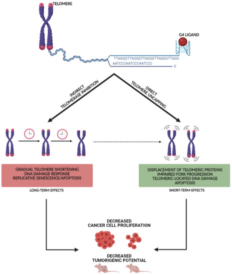 Literature data gathered thus far has allowed delineating a leading mechanism of action of telomeric G4 ligands in tumor models. Specifically, small-molecule-mediated stabilization of telomeric G4 has been repeatedly observed to produce two main and sometimes interconnected outcomes (Figure 2). In particular, long-term effects consequent to gradual telomere erosion, eventually leading to irreversible growth arrest (replicative senescence) of tumor cells, have been reported as the result of the indirect inhibition of telomerase activity in the presence of telomeric DNA locked into a G4 [14]. Moreover, short-term effects eventually leading to apoptotic cell death have been also described as a consequence of G4 ligand-mediated telomere uncapping, induction of telomeric DNA damage, impairment of fork progression and hence of telomere processing [14].