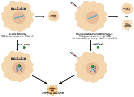 Schematic representation of G4 ligand-mediated synthetic lethality. In this context, the complementary treatment with a G4 ligand can be exploited to enhance killing of cancer cells characterized by specific genetic deficiency or upon pharmacological/chemical inhibition of the activity/expression of specific genes (created with BioRender.com).
