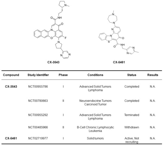 The chemical structures of the two G4 ligands under clinical testing and the related clinical trials have been reported. Study identifiers and information have been retrieved from www.clinicaltrials.gov accessed on 15 April 2021. N.A.: Not available.