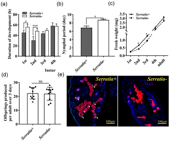Serratia facilitated growth and development of pea aphids. Duration of (a) each, and (b) total nymphal developmental stage (n = 30). (c) Fresh weight (n = 30). (d) Fecundity (n = 10). (e) DNA-FISH was used to detect Buchnera and Serratia within aphids. Aphid DNA was stained with DAPI (blue). Buchnera DNA was hybridized with Cy5-labelled DNA probe (red) and Serratia DNA was hybridized with Cy3-labelled DNA probe (green). Serratia+: Serratia-infected aphid, Serratia-: Serratia-free aphid. The scale bar = 100 μm. Data shown are means ± SE. * indicated significant differences based on the Student’s t test at p < 0.05 (* p < 0.05, *** p < 0.001), while ns indicated no significant difference.