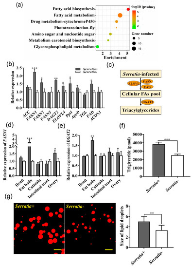 To assess the effect of Serratia infection on transcription of pea aphids, RNAseq was conducted using 2nd–3rd instar nymphs from Serratia-free and Serratia-infected aphids. Transcriptome analysis showed that 121 genes were significantly up-regulated in Serratia-infected aphids (Table S4), and 200 genes were significantly down-regulated relative to Serratia-free aphids (Table S5). KEGG analysis revealed that these differentially expressed genes (DEGs) were enriched in seven pathways including those for fatty acid biosynthesis and metabolism (Figure 2a, Table S3). Based on RNAseq data, 11 genes related to fatty acid metabolism were of high abundance, and six of them were confirmed by qPCR (Figure 2b). Of which, FASN1 and DGAT2, necessary for adipogenesis, displayed the greatest differences in gene expression (Figure 2c). Furthermore, we determined the relative expression of these two genes in different aphids’ tissues, and found that FASN1 and DGAT2 were almost four-fold and three-fold higher, respectively, in fat bodies of Serratia-infected aphids than those of Serratia-free aphids. In contrast, expression was comparable in other tissues with the exception of FASN1 in the ovary (Figure 2d,e). Since Serratia infection increased lipogenesis by up-regulating FASN1 and DGAT2, we then quantified the lipid contents in the aphid fat body, and showed that Serratia-infected aphids had more triacylglycerols and larger lipid droplets than Serratia-free aphids (Figure 2f,g).